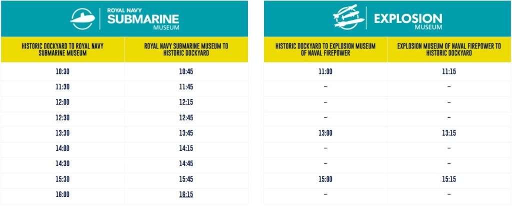 The Waterbus is subject to availability and prevailing weather conditions and its availability cannot be guaranteed. The waterbus leaves from the jetty alongside HMS Warrior. Please see the table below for the waterbus departure times.